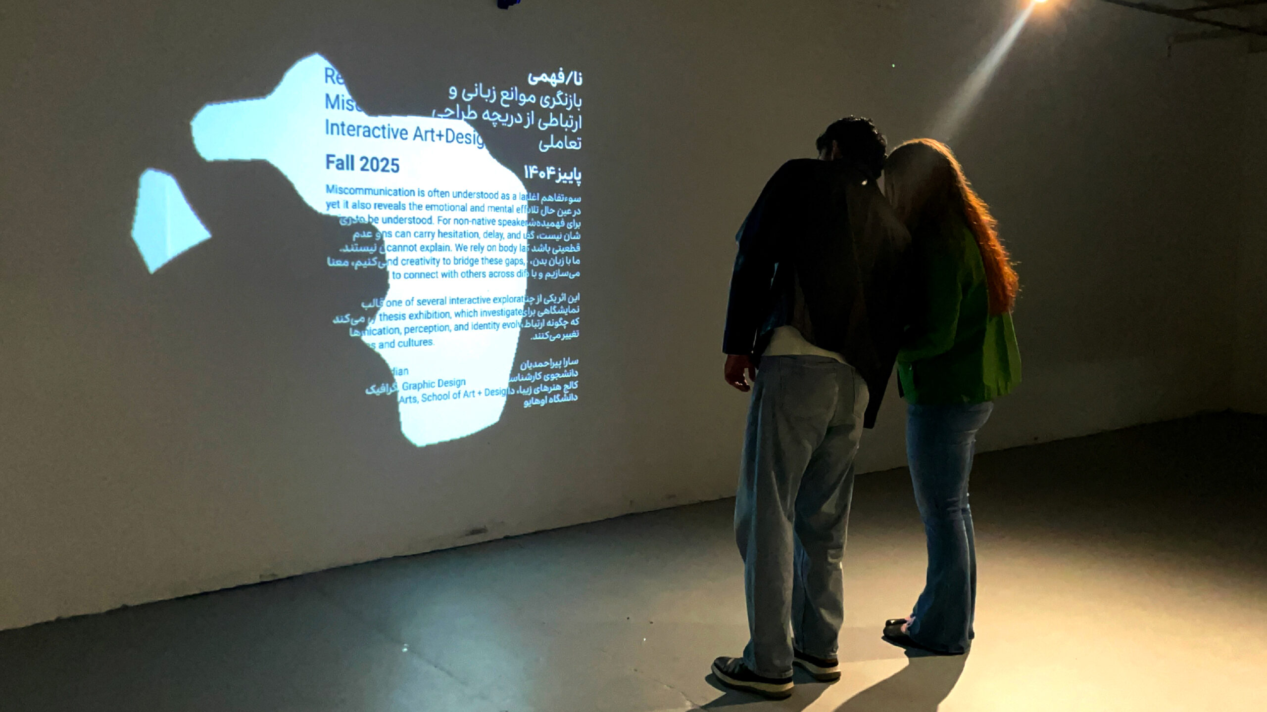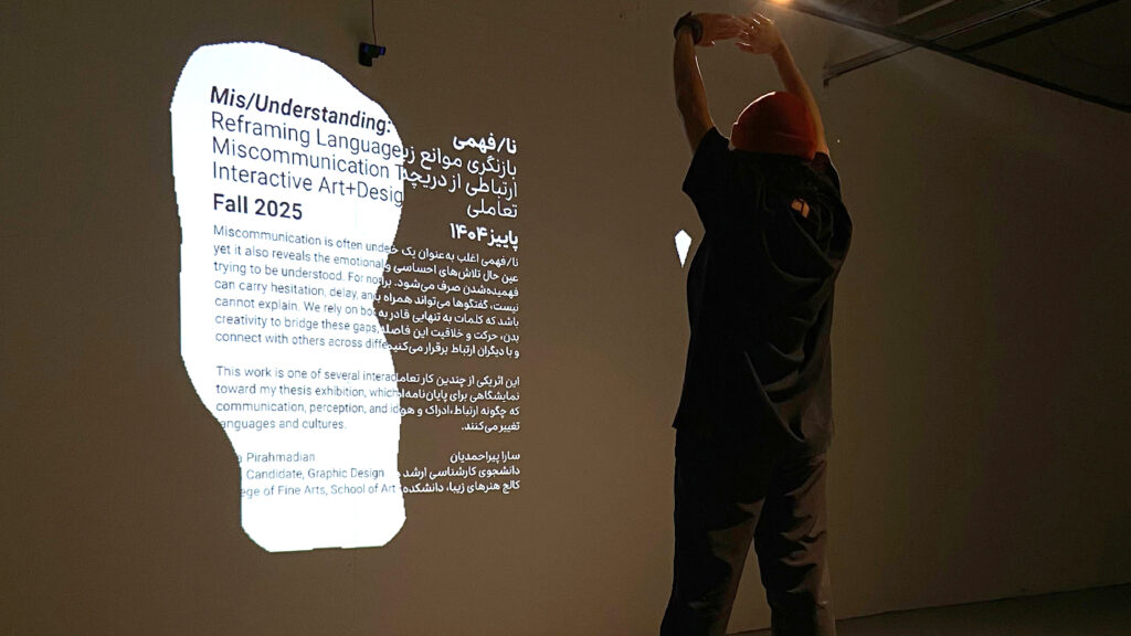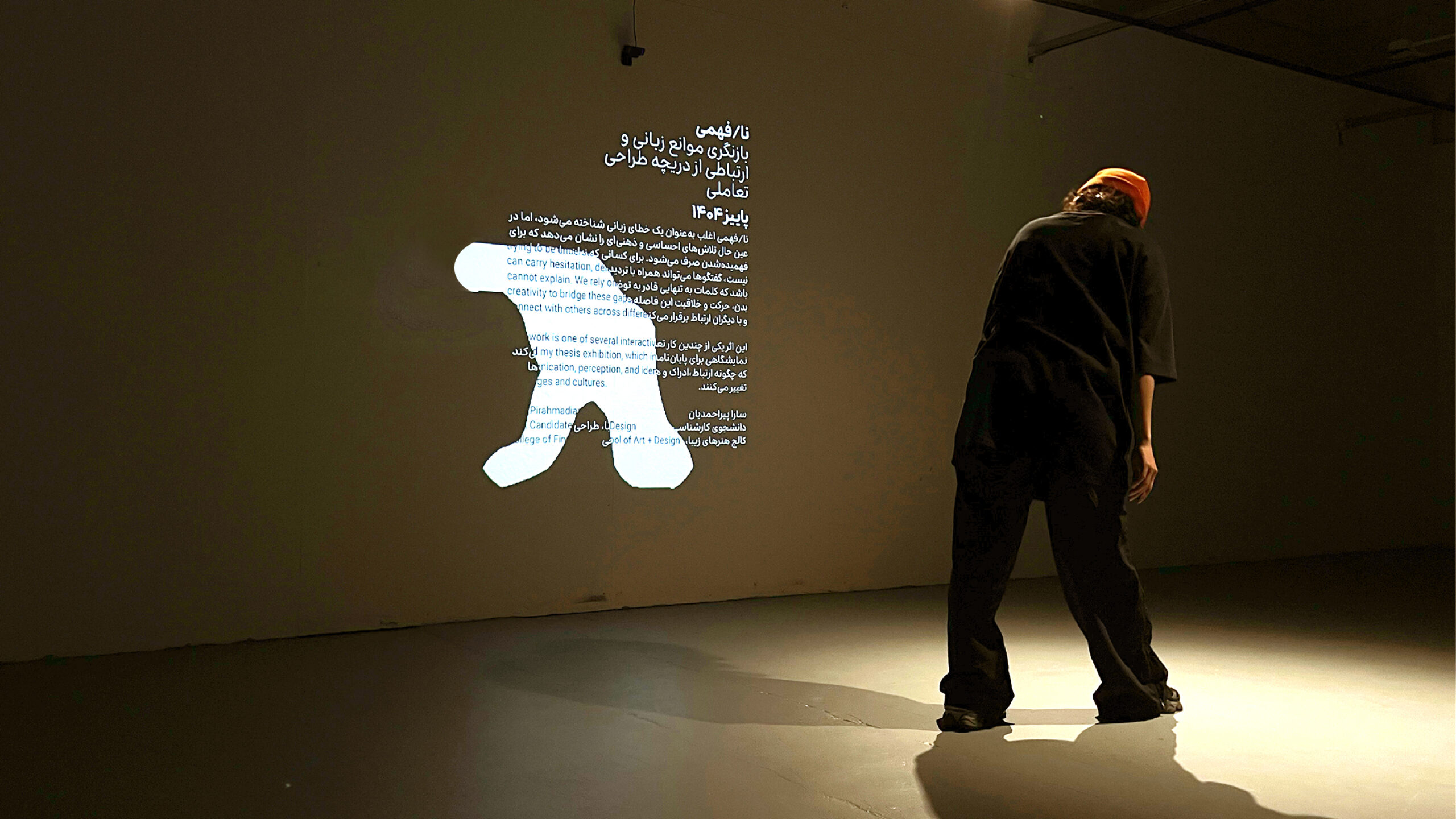 The project employed an exploratory, practice-based design research methodology that combined projection mapping, creative coding, and responsive technologies to construct environments where meaning is deliberately unstable. Works include wall text where English words gradually appear over Persian letters through the viewer’s body movement, echoing the struggle of non-native speakers who must often rely on body language to make themselves understood; a dual-microphone system that distorts or delays speech; motion-activated pieces that fragment words or faces in real time; and looping animations that represent anxiety, fear of misunderstanding, and the pressure to perform fluently.
