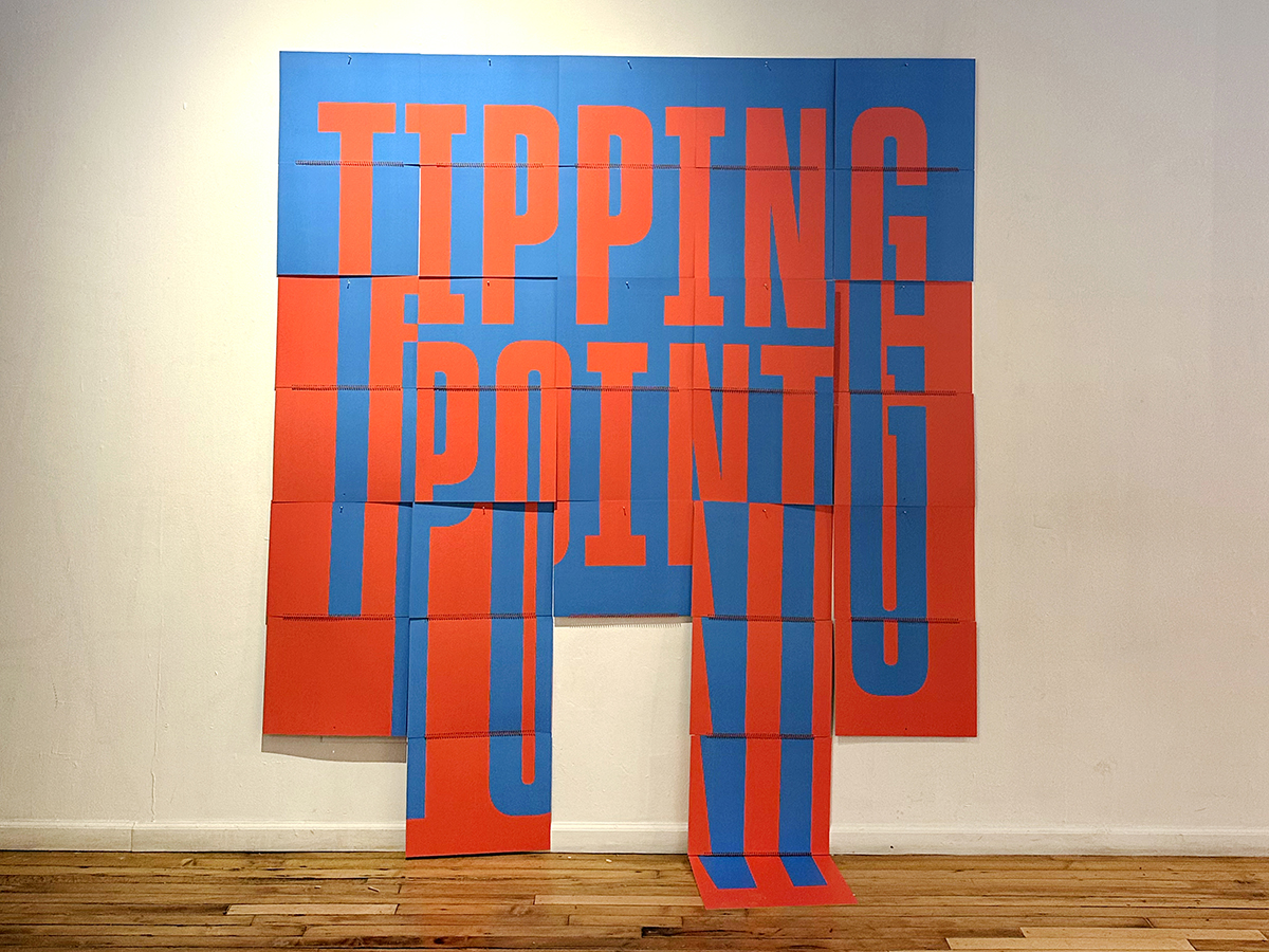Tipping Point, a large-scale typographic installation, evolved from research on ecological thresholds. The typography spans a grid of 25 panels, each representing a vulnerable environmental system. As viewers engage with the work, panels flip and disrupt the typography, triggering a transformative cascade of events from the wall to the floor. This participatory experience invites action and reflection upon this ecological instability.